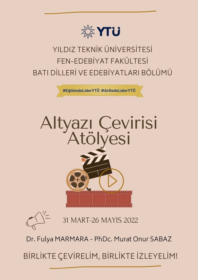 Bölümümüzde 31 Mart-26 Mayıs 2022 tarihleri arası her Perşembe Arş. Gör. Dr. Fulya Marmara ve Arş. Gör. Murat Onur Sabaz tarafından Altyazı Çevirisi Atölyesi düzenlenmiştir. Atölyeler sonunda tüm öğrencilere Katılım Sertifikası verilmiştir.