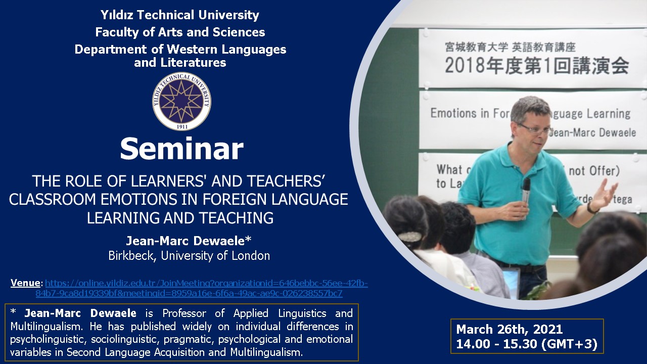 Londra Üniversitesi öğretim üyesi Prof. Dr. Jean-Marc Dewaele 26 Mart 2021 Cuma günü saat 14.00'te "Öğrencilerin ve Öğretmenlerin Sınıf Duygularının Yabancı Dil Öğrenim ve Öğretimindeki Rolü" başlıklı konuşmasıyla Bölümümüze konuk olmuştur.